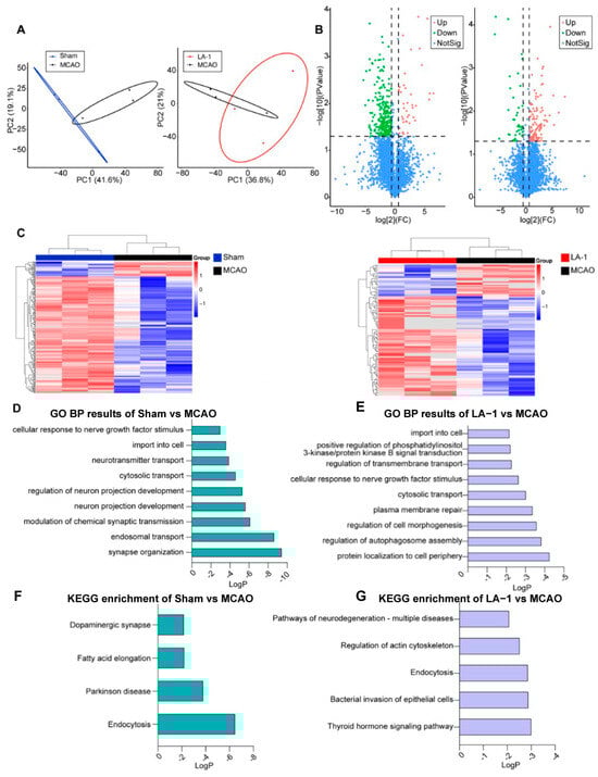 Identification of differentially expressed proteins from ischemic penumbra. (A) PCA of gene expression in Sham, MCAO, and LA-1-treated groups. (B) The proteome profiles in MCAO group compared with the Sham group, LA-1-treated group compared with the MCAO group. (C) The heatmap of DEPs in MCAO group compared with the Sham group, LA-1-treated group compared with the MCAO group, and the differential protein overlap: Sham vs. MCAO and MCAO vs. LA-1. (D) GO BP results of DEPs in MCAO group compared with the Sham group. (E) GO BP results of DEPs in LA-1-treated group compared with the MCAO group. (F) KEGG enrichment of DEPs in MCAO group compared with the Sham group. (G) KEGG enrichment of DEPs in LA-1-treated group compared with the MCAO group.
