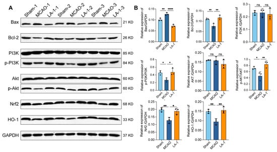 Based on our proteomic data, we examined the levels of proteins associated with PI3K-Akt and Nrf2/HO-1 pathways by Western blot (Figure 8A,B). Compared to sham group, the MCAO group exhibited significantly decreased levels of phosphorylated PI3K (p-PI3K), phosphorylated Akt (p-Akt), Nrf2, and HO-1, indicating that both PI3K-Akt and Nrf2/HO-1 pathways were inhibited during cerebral ischemia–reperfusion injury. In addition, the levels of pro-apoptosis protein Bax were elevated, while the levels of anti-apoptosis protein Bcl-2 were reduced significantly in MCAO group. After treatment with 10 mg/kg of LA-1, the abundance of all the proteins we detected was restored to normal levels. These findings strongly suggest that LA-1 mitigates MCAO-induced damage by activating the PI3K-Akt and Nrf2/HO-1 signaling pathways, and inhibiting the apoptosis pathway.