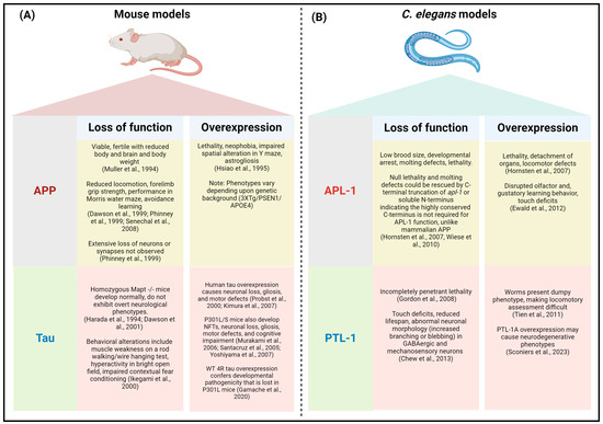 Comparative analyses of phenotypes in mouse models and Caenorhabditis elegans models of AD. (A) Overview presenting different behavioral observations owing to loss of function or overexpression of APP and tau in mice. While APP-null mice exhibit reduced viability and many behavioral phenotypes, tau-null mice develop normally with subtle behavioral alterations [145,146,147,148,149,150,151]. Overexpression of APP or tau leads to multitude of behavioral impairments, including lethality in APP-overexpressing mice [152,153,154,155,156,157,158]. (B) Summarizing phenotypic alterations in C. elegans with loss of function or overexpression of APL-1 and PTL-1. Null mutations in APL-1 and PTL-1 are lethal (incompletely penetrant in ptl-1-null worms) [42,70,73,159]. Overexpression of APL-1 and PTL-1 in worms also leads to presentation of many overt neurological phenotypes [30,42,72,160]. Image created using https://www.biorender.com.