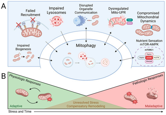 Mitophagy plays a central role in mitochondrial maintenance and homeostasis. Several key stress response pathways feed into mitophagy, which in turn coordinates other maintenance machinery to manage mitochondrial stress (A). Acute mitochondrial stress is resolved through the coordinated efforts of these homeostatic pathways, but prolonged stress can cause maladaptive changes (metabolic and epigenetic) which in this model would shift homeostasis toward pathology (B). The degree to which the dysregulation of any illustrated MQC pathways contribute to mitochondrial maladaptation and disease pathology in actual AD, as opposed to experimental AD models, is currently uncertain but a topic of great interest. This figure was created using https://www.biorender.com.
