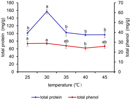 Effects of different temperatures on the total protein and total phenol contents of fermented M. oleifera leaves. Note: different letters in the figure indicate significant differences, p < 0.05.