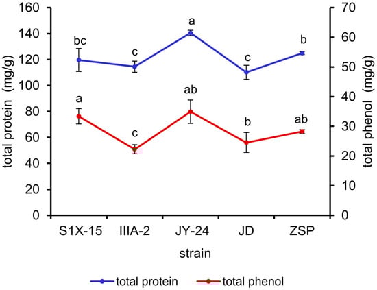Effects of different strains on the total protein and total phenol contents of fermented M. oleifera leaves. Note: different letters in the figure indicate significant differences, p < 0.05.