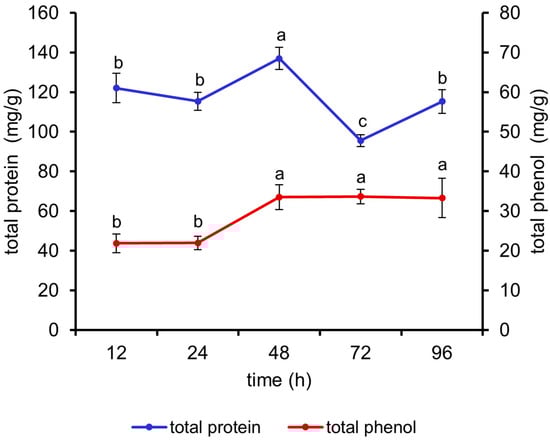 Effects of different fermentation times on the total protein and total phenol contents of fermented M. oleifera leaves. Note: different letters in the figure indicate significant differences, p < 0.05.
