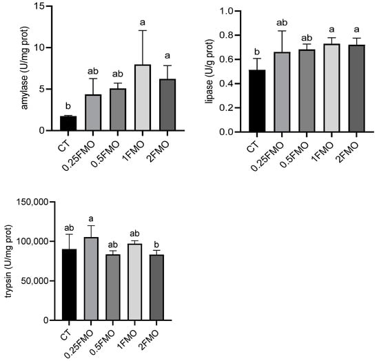 The results of digestive enzymatic activities are shown in Figure 5. The addition of fermented M. oleifera leaves significantly increased the α-amylase activity (p < 0.05). The 1FMO and 2FMO groups showed significantly increased lipase activity (p < 0.05), and the 2FMO group showed significantly decreased trypsin activity compared to the 0.25 group (p < 0.05), while the rest of the additive groups did not show any significant difference compared to the control group (p > 0.05).
