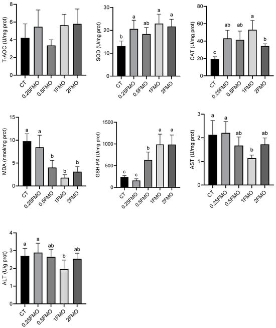 The results of the antioxidant enzymatic activities of the crayfish are shown in Figure 6. There was no significant difference in the total antioxidant capacity (T-AOC) among the groups (p > 0.05). The 0.25FMO, 1FMO, and 2FMO groups showed significantly increased SOD activity in contrast with the CT group (p < 0.05); the addition of the fermented M. oleifera leaves significantly increased the CAT activity compared to that of the CT group (p < 0.05). The 0.5FMO, 1FMO, and 2FMO groups showed significantly decreased MDA contents and increased GSH-Px activities compared to those of the CT group (p < 0.05), and the 1FMO group showed significantly reduced AST and ALT contents in contrast to those of the CT group (p < 0.05).