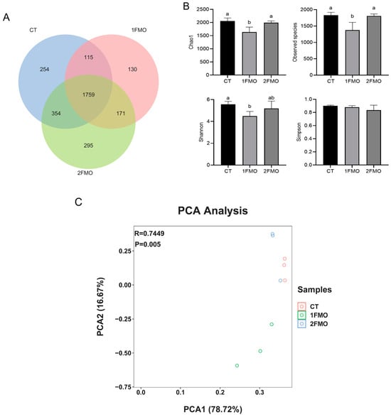 Analysis of the PCA results showed that the differences in the community structure between the CT and 2FMO groups were small, and the differences in the community structure between the 1FMO and CT groups were large (Figure 7C).