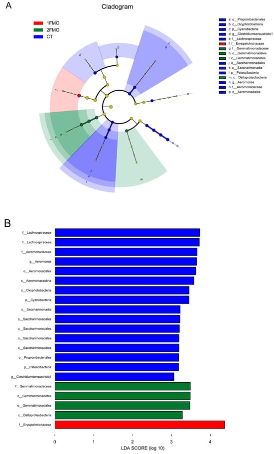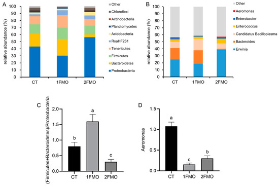 The (Firmicutes + Bacteroidetes)/Proteobacteria ratio was significantly higher in the 1FMO group than in the CT group, while the ratio was significantly lower in the 2FMO group (p < 0.05, Figure 8C); the abundance of Aeromonas was significantly lower in the 1FMO group than in the CT and 2FMO groups (p < 0.05, Figure 8D).