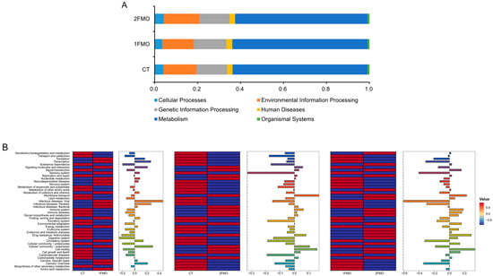 The results of the KEGG-enriched pathway analysis are shown in Figure 10. The CT group, 1FMO group, and 2FMO group pathways were mainly enriched in cellular processes, genetic information processes, metabolism processes, environmental information processes, human diseases, and organismal systems, especially metabolic systems.