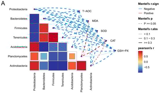 The crayfish gut phylum-level microorganisms and genus-level microorganisms were correlated with antioxidant indicators, and the results are shown in Figure 11. At the phylum level (Figure 11A), T-AOC and GSH-Px were all negatively correlated with Proteobacteria, Bacteroidetes, Firmicutes, Tenericutes, Acidobacteria, Planctomycetes, and Actinobacteria (p > 0.05). MDA and SOD were negatively correlated with Proteobacteria, Bacteroidetes, Firmicutes, Tenericutes, Acidobacteria, and Actinobacteria and positively correlated with Planctomycetes (p > 0.05). CAT was negatively correlated with Proteobacteria, Bacteroidetes, and Acidobacteria and positively correlated with Firmicutes, Tenericutes, Planctomycetes, and Actinobacteria (p > 0.05).