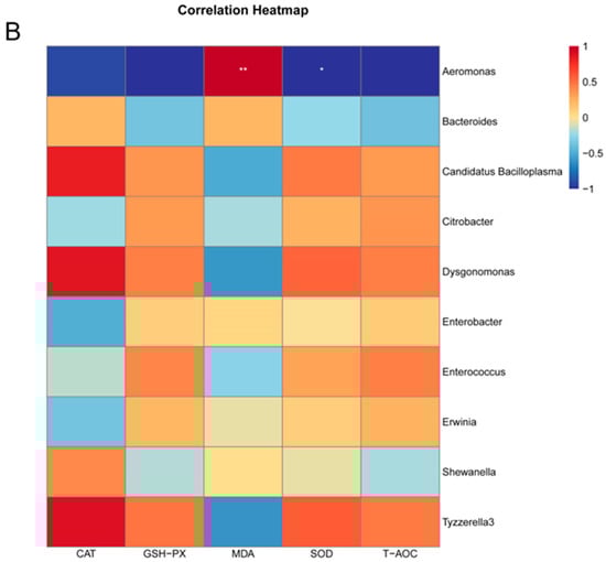 At the genus level (Figure 11B), T-AOC was negatively correlated with Aeromonas, Bacteroides, and Shewanella and positively correlated with Tyzzerella3, Enterococcus, Dysgonomonas, Citrobacter, Candidatus Bacilloplasma, Erwinia, and Enterobacter (p > 0.05). SOD was positively correlated with Tyzzerella3, Dysgonomonas, Candidatus Bacilloplasma, Enterococcus, Citrobacter, and Erwinia; negatively correlated with Bacteroides, Shewanella, and Enterobacter (p > 0.05); and significantly negatively correlated with Aeromonas (p < 0.05). MDA was negatively correlated with Tyzzerella3, Dysgonomonas, Candidatus Bacilloplasma, Enterococcus, Citrobacter, and Erwinia; positively correlated with Bacteroides, Shewanella, and Enterobacter (p > 0.05); and significantly positively correlated with Aeromonas (p < 0.05). GSH-Px was positively correlated with Tyzzerella3, Dysgonomonas, Candidatus Bacilloplasma, Enterococcus, Citrobacter, Erwinia, and Enterobacter and negatively correlated with Aeromonas, Bacteroides, and Shewanella (p > 0.05). CAT was positively correlated with Tyzzerella3, Dysgonomonas, Candidatus Bacilloplasma, Shewanella, and Bacteroides and negatively correlated with Aeromonas, Enterobacter, Erwinia, Citrobacter, and Enterococcus (p > 0.05).