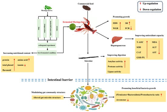 In conclusion, the optimal fermentation conditions for M. oleifera leaves were the fermentation strain of B. amyloliquefaciens JY-24 (107 CFU mL−1), a material/water ratio of 10%, a fermentation time of 48 h, and a fermentation temperature of 30 °C. These resulted in the production of a high-protein, high-total-phenol, high-amino-acid, and low-tannin product for M. oleifera leaves. According to the above experimental results, we summarize the positive effects of fermented M. oleifera leaves on crayfish (Figure 12). Briefly, the incorporation of 1% fermented M. oleifera leaves improves the growth of the crayfish by increasing the antioxidant capacity of the hepatopancreas, increasing the digestive capacity of the intestine, inhibiting the abundance of pathogenic bacteria, and promoting the growth of value-added beneficial intestinal bacteria. Nevertheless, this experiment was deficient in mechanistic studies on crayfish, and further research is required to explore the functional mechanism of the antioxidant capacity of fermented M. oleifera leaves.