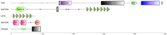 - Adami, A.; García-Álvarez, B.; Arias-Palomo, E.; Barford, D.; Llorca, O. Structure of TOR and its complex with KOG1. Mol. Cell 2007, 27, 509–516. [Google Scholar] [CrossRef] [PubMed]