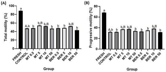 3.1. Effects of MT and BER on the Motility of Frozen-Thawed Sperm