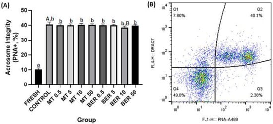 3.5. Effects of MT and BER on the Acrosome Integrity of Frozen-Thawed Sperm