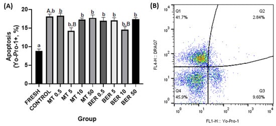 3.6. Effects of MT and BER on the Apoptotic-like Changes of Frozen-Thawed Sperm