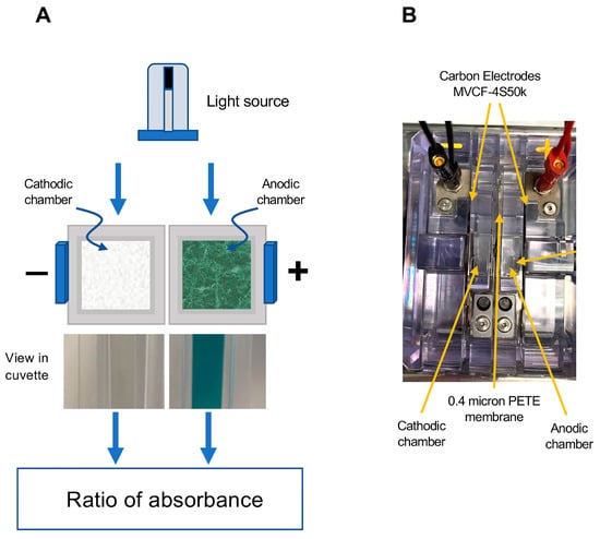 Diagrammatic depiction of the electrochemical cell used to activate ABTS for the free radical scavenging/formation assay. (A) Following the passage of current, ABTS is oxidized to the blue-green ABTS•+ cation radical in the anodic chamber, which can be read at 734 nm. The reducing environment of the cathodic chamber does not allow this chemistry to occur, so it serves as a control channel, permitting the assessment of interference due to turbidity. The chambers are separated by a semipermeable 0.4 µm PETE (Polyester Track Etched) membrane to allow the passage of current. (B) Aerial perspective of the actual electrochemical device showing the position of the anodic and cathodic chambers, the MVCF-4S50k electrodes and the chamber separation membrane.