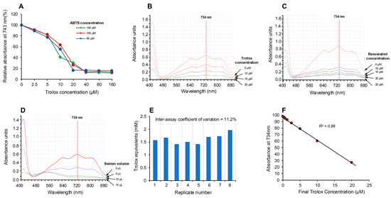 Electrochemical activation of ABTS and its application in the assessment of free radical scavenging activity. (A) Electrochemical activation of ABTS for 20 s generated the colored ABTS•+ radical cation, which absorbed intensely at 734 nm but could be suppressed by post-activation addition of the antioxidant Trolox, in a manner that was not significantly changed by ABTS concentrations ranging from 60 to 140 µM. (B) The absorption spectrum generated by ABTS•+ showing the peak at 734 nm and the dose-dependent suppression achieved by Trolox. (C) A similar dose-dependent suppression of ABTS•+ absorption at 734 nm achieved with resveratrol. (D) Using unfractionated human semen as a rich biological source of antioxidant activity, a dose-dependent decrease in absorption at 734 nm was achieved. (E) Repeated analysis of the same human semen sample generated an inter-assay coefficient of variation of 11.2% with this post-activation, electrochemical ABTS assay (n = 8). (F) A detailed dose–response analysis with Trolox demonstrated that the suppression of ABTS•+ absorption was linear over the final concentration range, 0.31–20 µM.