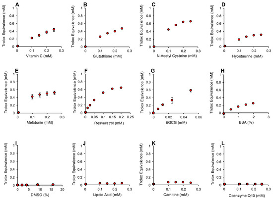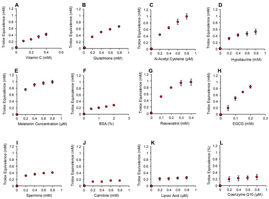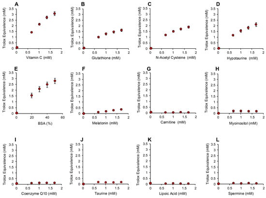 Use of the post-activation electrochemical ABTS assay for free radical scavenging activity to determine the ability of candidate antioxidants to suppress the ABTS•+ signal. Dose-dependent analyses were conducted for (A) vitamin C, (B) glutathione, (C) N-acetyl cysteine, (D) hypotaurine, (E) BSA, (F) melatonin, (G) carnitine, (H) myoinositol, (I) coenzyme Q10, (J) taurine, (K) lipoic acid and (L) spermine. All results are presented as the concentration of reagent in Trolox equivalents in the original 15 µL inoculant into the medium. All data points represent the mean ± SE of 3 independent replicates.