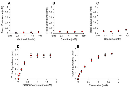 Assessment of antioxidant activity using the post-activation ABTS assay. Log dose response analyses for (A) myoinositol, (B) carnitine and (C) spermine failed to reveal any free radical scavenging activity. In contrast, both polyphenols, (D) epigallocatechin gallate (EGCG) and (E) resveratrol, exhibited such powerful antioxidant activity that they reached a plateau at concentrations above 0.676 mM (10 µM final concentration). All data points represent the mean ± SE of 3 independent replicates.