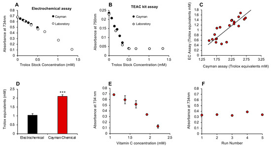 To determine how this rapid antioxidant assay compared with the conventional ABTS assay marketed by the Cayman Chemical Company (Ann Arbor, MI, USA), we took the Trolox standards from each assay and analyzed them using either the electrochemical activation protocols described in this study or the Cayman kit. This analysis indicated that, while the results for Trolox standards were superimposable regardless of which assay was used, the electrochemical activation assay was clearly linear over a much greater range of concentrations (Figure 5A,B).
