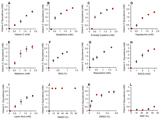 Pre-activation electrochemical ABTS assay to determine the ability of antioxidants to suppress formation of the ABTS•+ signal. Dose dependent analyses were conducted for (A) vitamin C, (B) glutathione, (C) N-acetyl cysteine, (D) hypotaurine, (E) melatonin, (F) BSA, (G) resveratrol (H) EGCG, (I) lipoic acid, (J) DMSO, high dose, (K) DMSO low dose and (L) DMF. All results are presented as the concentration of reagent in the original solution. All data points represent the mean ± SE of 3 independent replicates.