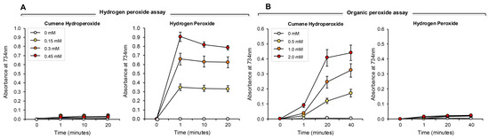 Development of ABTS assays for hydrogen- and organic- peroxides. (A) The hydrogen peroxide assay was completely unresponsive to 0.15–0.45 mM cumene hydroperoxide over a time scale of 20 min. However, the assay responded extremely rapidly to the presence of the same doses of hydrogen peroxide, such that a clear dose–response was evident at the earliest time point assessed (~1 min). Once generated, the ABTS•+ radical was relatively stable, although some deterioration on the signal was evident over 20 min with the highest standard assessed. (B) Conversely, the cumene hydroperoxide assay was extremely sensitive to 0.5–2.0 mM organic peroxide, but did not respond at all to hydrogen peroxide over the 40 min incubation period. Unlike the hydrogen peroxide assay, the generation of an ABTS•+ signal following exposure to cumene hydroperoxide and hematin was not instantaneous, but evolved gradually. The results represent the mean ± SE of 3 independent experiments.