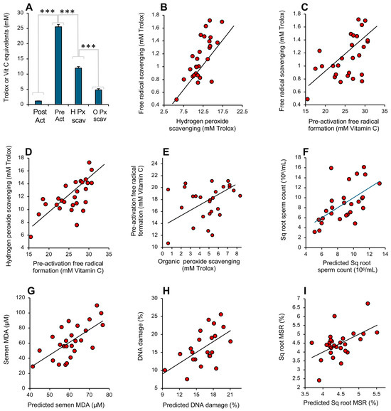 All of the assays were therefore recording different facets of the same fundamental protective mechanism, and, as such, the activities they measured in semen were generally correlated, even though the absolute levels of antioxidant activity they recorded varied greatly (Figure 10B–E). The highest correlation was observed between the post-activation free radical- and hydrogen peroxide-scavenging activities (r2 = 0.52; p < 0.001) while the lowest was between the organic peroxide and pre-activation electrochemical assay (NS). The assay that is optimal for any given situation presumably varies with the nature of the ROS involved and the vulnerabilities of the target cell type. Thus, if the MDA level in unfractionated semen is used as a marker of oxidative stress in male fertility [33,34], then the hydrogen peroxide scavenging assay was found to be the most highly correlated with this parameter (r2 = 0.17; p < 0.05). Alternatively, if sperm count or progressive motility is selected as a variable reflective of semen quality, then the pre-activation electrochemical assay generated the best correlations with the same group of 27 donors (r2 = 0.23; p < 0.05 and r2 = 0.16; p < 0.05, respectively). With mitochondrial ROS generation, it was the organic peroxide assay that dominated (r2 = 0.21; p < 0.05). In order to capture all the information contained within the 4 antioxidant assays in making predictions of human semen quality, we next undertook a series of multiple regression analyses using semen quality biomarkers as the dependent variables. This form of analysis considers to what extent a dependent variable (in this case, some aspect of semen quality, like motility) can be modeled using data from a group of independent variables (in this case, different measurements of antioxidant activity). Using this approach, predictive algorithms could be written using the antioxidant data that exhibited highly significant correlations with seminal characteristics related to oxidative stress including sperm count (r2 = 0.34; p < 0.01; Figure 10F), seminal MDA (r2 = 0.43; p < 0.001; Figure 10G), sperm DNA damage (r2 = 0.31; p < 0.01; Figure 10H) and mitochondrial ROS generation (r2 = 0.27; p < 0.01; Figure 10I).