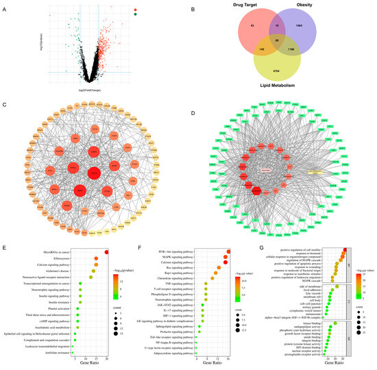 The network pharmacology analysis of ABS. (A) DEGs screening and presentation as Volcano plots. (B) The Venn diagram between the drug targets, obesity targets, and lipid metabolism. (C) The PPI network of the interacting targets. (D) The drug–compounds–targets–disease network. (E) The dot plot of KEGG pathway enrichment analysis. (F) The dot plot of KEGG signaling pathway enrichment analysis. (G) The dot plot of GO enrichment analysis. BP, biological process; CC, cellular component; MF, molecular function.