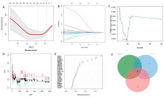 Selection of characteristic genes of intersection genes. (A) Ten-time cross-verification of tuning parameters in the LASSO model. Each curve refers to one gene. Solid vertical lines indicate the standard error (SE) of the partial likelihood deviation and dotted vertical line marks the optimal lambda value. (B) In the LASSO coefficient profile, adjustment of feature selection in the minimum absolute shrinkage and selection operator model. (C) The SVM-RFE algorithm was used for selecting features. (D) Examining the correlation between the count of trees in a random forest and the error rate. The red dotted line indicates the Training Error, which is how the model behaves on the training set. The black implementation indicates the Validation Error, which is how the model behaves on the validation set. The green dotted line indicates the Test Error, which is how the model behaves on the test set (E) Ranking of genes based on their relative importance. (F) A Venn diagram depicting genes common to the LASSO, random forest, and SVM-RFE methods.
