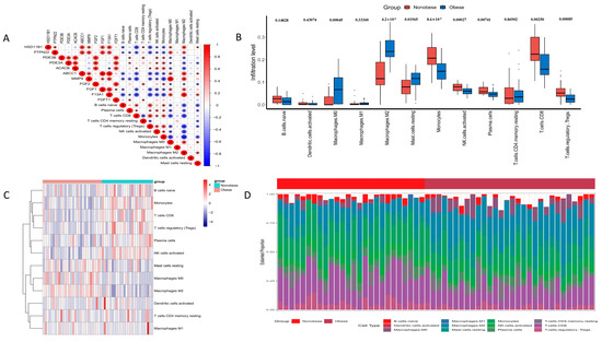 Immune infiltration study of character genes. (A) demonstrates a robust correlation among 11 genes, where red denotes a positive correlation, blue indicates a negative correlation, and “*” signifies a statistically significant correlation. Red color represents positive correlation, blue color represents negative correlation, and “*” indicates statistically correlation (B) illustrates variations in immune cell infiltration across different samples. (C) shows the disparity in immune cell infiltration between groups with and without obesity, which was statistically assessed, with “ns” indicating that the difference was statistically insignificant. (D) indicates the difference in immune cell infiltration between the groups with and without obesity.