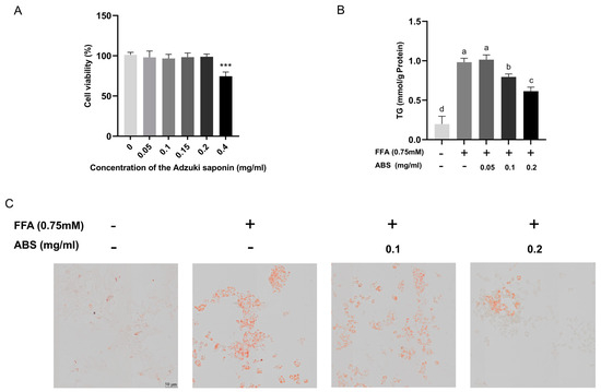 The anti-obesity effect of ABS on HepG2 cells. (A) The effect of ABS on the cell viability of HepG2 cells. *** p < 0.001. (B) Effect of ABS on the triglyceride (TG) content in HepG2 cells. (C) Oil Red O (ORO) staining of free fatty acid (FFA)-induced HepG2 cellular model with or without treatment of adzuki bean saponins (ABS) at different doses. Figures are captured through scanning system of VS200 slide scanner system (Olypums, Tokyo, Japan) with a 40× objective. Scale bar, 50 μm. All results are presented as mean ± S.D and the experiments were repeated as triplicates. Bars with different letters (a–d) significantly (p < 0.05) differ according to ANOVA and Tukey’s multiple range test. FFA, free fatty acid; ABS, adzuki bean saponins.
