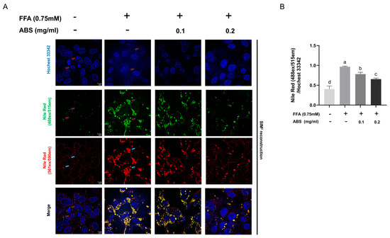 To explore the inhibition effect of lipid accumulation of ABS, we used different dosages to treat the modeled HepG2 cell. We determined the TG content (Figure 5B). The results showed that the TG content in the model group increased significantly compared with the control group and ABS can dose-dependently decrease the intracellular TG content in the dosages between 0.1 mg/mL and 0.2 mg/mL. In addition, the 0.05 mg/mL ABS treatment did not show any effect. The dosages in our further study are set as up to 0.1 mg/mL and 0.2 mg/mL. We also used ORO staining to evaluate lipid droplet generation (Figure 5C). The results also showed that both 0.1 mg/mL and 0.2 mg/mL ABS can decrease lipid droplet generation, which is similar in the intracellular TG content testing. Moreover, we also conducted the Nile Red and Hochest 33342 double staining (Figure 6). Nile Red (NR), a lipophilic staining, is of an intensive red fluorescent signal (~552 ex/635 em) after interaction with lipids. Since NR binding with the lipid bilayer of a cell membrane also induces a strong red signal, and considering the fact that NR binding with an intracellular lipid droplet induces a specific green fluorescent signal [44] (~488 ex/528 em), we used two super-high-speed cameras and a long-pass (LP) filter (LP560) to capture both the green (488 ex/495~550 em) and red (561 ex/570~620 em) signals simultaneously after excitation with both a 488 and 561 nm laser. Therefore, we can clearly observe the total lipid distribution and FFA-induced lipid droplet status at the same time. Meanwhile, Hochest staining for the chromosomes was applied for location under microscope (405 ex/420~480 em) (Figure 6A).
