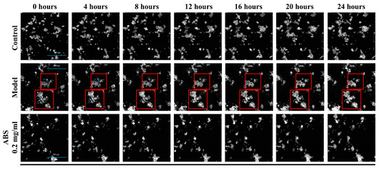 Quantitative phase imaging (QPI) of 24-hour observation (captured every 0.5 hours) of FFA-induced model with or without treatment of ABS performed using a Livecyte2 microscope with a 10× objective. Control is the HepG2 cell treated with the MEM medium; model is the HepG2 cell treated with the MEM medium containing the free fatty acid; ABS 0.2 mg/mL is the HepG2 cell treated with the MEM medium containing the free fatty acid and 0.2 mg/mL dosage of the adzuki bean saponins. Blue Arrow: Time-lapse change of single cell with fluorescence re-distribution.