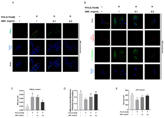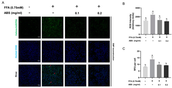 To study the ROS generation in our ABS treatment group, we used the Carboxy-H2DCFDA and Hochest 33,342 co-staining analysis (Figure 8A). In the normal cells, few green foci (ROS signal) are found, while FFA introduction facilitates bright green foci formation intracellularly—some of which are co-located with blue signal aggregation (chromosome) (red arrow), while others are distributed in the cytoplasm—both indicating that ROS stress the cellular survival status like DNA condensation. ABS introduction alleviates the amount of green fluorescent signal and bright foci in a dose-dependent manner at the single-cell level. Meanwhile, the semi-quantitative analysis of the staining was conducted, and the results showed that ROS increase significantly in comparison to the model group, and the treatment of 0.1 mg/mL and 0.2 mg/mL ABS can decrease the ROS level significantly. Interestingly, the ABS dosage at either 0.1 mg/mL or 0.2 mg/mL did not show as statistically significant (Figure 8B). Furthermore, we also conducted research on the ROS level at the cellular level (bulk culture) through the microreader using the same dye (Carboxy-H2DCFDA) (Figure 8C). This result is also similar to the semi-quantitative analysis. ROS can damage the mitochondrial membrane, leading to a decrease in its potential, which is essential for ATP synthesis and cellular energy production. Thus, the change in ROS level indicated that the anti-obesity effect of ABS may be associated with mitochondrial energy metabolism since this is an important source of ROS driven by the TCA cycle at either the single-cell level or bulk culture grade.