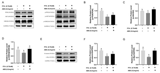 HepG2 cells were cultured in a 6-well plate (8 × 105 cells/well) and treated with FFA and ABS based on the description in Section 2.11. The culture medium was discarded and washed with 1 mL 1× PBS solution, and 80 μL frozen RIPA solution containing a final concentration of 2 µg/mL of aprotinin, 5 µg/mL of leupeptin, 1 µg/mL of pepstatin A, 5 mM of NaF, 1mM of Na3VO4, and 1 mM of PMSF was added to each well and placed on ice for 30 min. In addition, the nuclear protein sample for the Western blot was prepared based on the instructions of the Nuclear and Cytoplasmic Protein Extraction Kit. The supernatants were collected and the BCA protein assay kit was used to determine the total protein concentration of each sample. The sample was dissolved in 5x protein sample loading buffer, vortexed, and boiled at 100 °C for 10 min. Protein samples were separated by 10% SDS-PAGE gel. All imprints were transferred onto the PVDF membrane by electrophoresis and the membrane was sealed at room temperature for 2 h using TBST buffer containing 5% non-fat milk. The PVDF membrane was incubated with the corresponding primary antibody (PI3K, p-PI3K, Akt, p-Akt, GSK-3β, p-GSK-3β, β-catenin, c-Myc, Lamin B1, and GAPDH; 1:1000 dilution) at 4 °C for twelve hours. The PVDF membrane was washed thrice by TBST buffer for 15 min each time. Next, the PVDF membrane was incubated with the secondary anti-rabbit IgG (H+L) antibodies (1:5000 dilution) at room temperature for 1 h. The PVhDF membrane was washed by TBST buffer thrice for 15 min each time. The protein strips on the PVDF membrane were scanned by the Image Quant LAS 500 imaging system (GE Healthcare Bio-Sciences AB, Sweden) and visualized by Image J software v1.8.0 (National Institutes of Health, Rockville, MD, USA). The protein strips were standardized by GAPDH or Lamin B1, and all results were independently repeated three times.