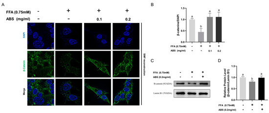 The HepG2 cells (~900,000 cells per well) were cultured in black glass-bottom cell culture dish (Cat: BS-15-GJM-B) (Biosharp, Hefei, China) and treated the same as outlined above. When the time point was reached, medium with or without ABS was removed, and afterward, cells were washed six times with the commercially sourced 1× PBS. Cells were then fixed with 4% paraformaldehyde for at least 10 min. Subsequently, cells in the culture dish were permeabilized by 0.25% Triton X-100 diluted in 1× PBS for 15 min, and then blocked with commercial QuickBlock mixture for 1.5 h at room temperature. Afterward, the blocking solution was removed, and cells were incubated with the primary antibody, β-catenin, which was diluted into a commercial primary antibody diluent at 1:100 for 24 h at 4 °C statically. When the time point was reached, cells were washed six times before incubation with secondary antibody—Fluorescein (FITC)-conjugated Affinipure Goat Anti-Rabbit IgG (H+L)—which was diluted into commercial secondary antibody diluent at 1:80 for 1 h at 37 °C statically with protection from light. Afterward, the incubation solution was removed, and the cells in the culture dish were washed six times with the commercially sourced 1× PBS before counter-staining with commercial DAPI staining solution, dilution at 1:1000, for 15 min at room temperature (RT) with protection from light. This was followed by washing in PBS 6 times, and cells were visualized by applying ZEISS Elyra 7 with Lattice SIM2 super-resolution fluorescent microscope (ZEISS, Oberkochen, Germany) applying a 63× oil-immersion objective.