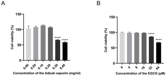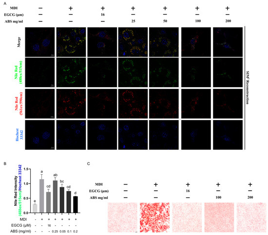 The 3T3-L1 cells were cultured into 96-well plates and exposed to different concentrations of ABS (0, 0.05, 0.1, 0.2, 0.3, and 0.4 mg/mL) and EGCG (0, 4, 8, 16, and 32 µM) for 24 h. The further processing was the same as above.