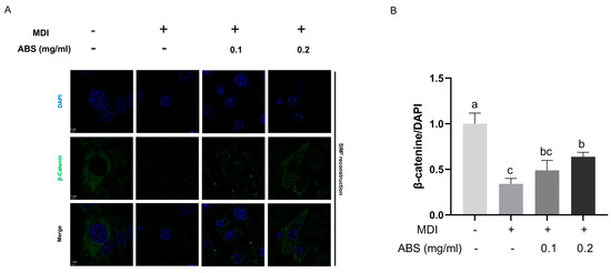 The regulation effect of ABS on protein level of β-catenin. (A) Fluorescent images of 3T3-L1 cells containing immuno-fluorescent signal of β-catenin (green) and counter-stained with DAPI (blue) taken by ZEISS Elyra 7 equipped with Lattice structured illumination microscopy (SIM)2 super-resolution fluorescent microscope with a 63× oil-immersion objective. Scale bars, 5 μm. MDI, adipogenesis differentiation medium; ABS, adzuki bean saponins. (B) Semi-quantitative analysis based on original images taken by SIM2 of relative green fluorescence signal (β-catenin), normalized by dividing to blue fluorescence signal (DAPI) by Image J. Bars with different letters (a–c) significantly (p < 0.05) differ according to ANOVA and Tukey’s multiple range test.
