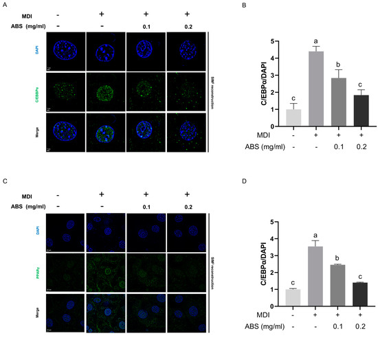 The regulation effect of ABS on protein level of transcriptional factor C/EBPα and PPARγ. (A) Fluorescent images of 3T3-L1 cells containing immuno-fluorescent signal of CEBP/α (green) and counter-stained with DAPI (blue) taken by ZEISS Elyra 7 equipped with Lattice structured illumination microscopy (SIM)2 super-resolution fluorescent microscope with a 63× oil-immersion objective. Scale bars, 5 μm. (B) Semi-quantitative analysis based on original images taken by SIM2 of relative green fluorescence signal (CEBP/α), normalized by dividing to blue fluorescence signal (DAPI) by Image J. (C) Fluorescent images of 3T3-L1 cells containing immuno-fluorescent signal of PPARγ (green) and counter-stained with DAPI (blue) taken by ZEISS Elyra 7 equipped with Lattice structured illumination microscopy (SIM)2 super-resolution fluorescent microscope with a 63× oil-immersion objective. Scale bars, 10 μm. (D) Semi-quantitative analysis based on original images taken by SIM2 of relative green fluorescence signal (PPARγ), normalized by dividing to blue fluorescence signal (DAPI) by Image J. All results are presented as mean ± S.D and the experiments were repeated as triplicates. Bars with different letters (a–c) significantly (p < 0.05) differ according to ANOVA and Tukey’s multiple range test. MDI, adipogenesis differentiation medium; ABS, adzuki bean saponins.