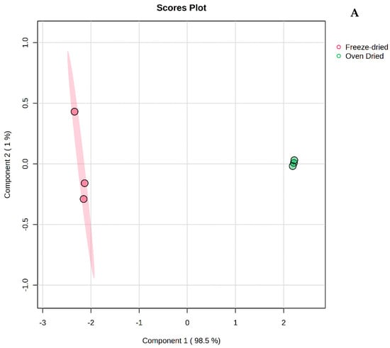 Metabolites present in the oven-dried and freeze-dried spiny saltbush separated the two groups on the PCA score plot (Their corresponding loadings are given in Table S3). On the PCA loading plot (Figure 2B), the compound at m/z 316.284 (Retention time (RT): 7.971 min), identified as dehydrophytosphingosine, was loaded positively of PC1 (r = 0.41), while it was loaded positively on PC2 (r = 0.80). Further, PLS-DA was used to clarify the variation between the oven-dried and freeze-dried spiny saltbush based on their metabolite profiles. The first two components (PC1 98.5% and PC2 1%) explained 99.5% (Figure 3A) of the variation in the metabolites, which showed two clusters. Figure 3B displays the loading of the metabolites on the PLS-DA components 1 and 2, and the loading of metabolites is presented in Supplementary Table S4. The compound at m/z 316.2848 (dehydrophytosphingosine, RT:7.971 min) was loading positively on PC1 (r = 0.41), while the compounds at m/z 759.200 (RT: 4.06 min) and m/z 773.215 (RT: 3.948 min), identified as quercetin 3-sambubioside-7-glucoside and kaempferol 3-sophorotrioside, respectively, were loaded negatively (r = −0.37 and −0.38, respectively). On PC2, dehydrophytosphingosine was loaded negatively (r = −0.80). The PLS-DA model displays good prediction (Q2 = 0.99) and goodness-of-fit (R2 = 0.99) levels.