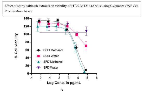 Treatment concentration–response curves for spiny saltbush oven-dried (SOD) and spiny saltbush freeze-dried (SFD) methanol and water extracts expressed as percentage viable intestinal cells, HT29-MTX-E12 (A) and Caco2 (B) remaining after 2 h treatment compared to the HBSS control in CyQUANT® NF Cell Proliferation Assay. The data are presented as the mean percentage (±SEM) of three replicates for each treatment.