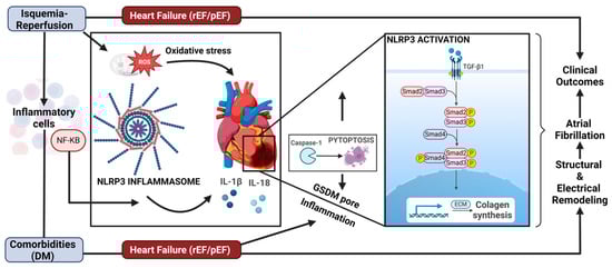 Existing clinical data associate the level and activity of white blood cells with POAF incidence. Patients who have higher PMN neutrophil counts after surgery are significantly more susceptibility to developing electrical instability and POAF [,,], and patients developing POAF tend to have a greater activation of PMN and decreased electrical conduction velocity in comparison to mice treated with angiotensin II, a known arrhythmogenic stimulus []. Moreover, the elevated preoperative PMN neutrophils count and HATCH score in patients subjected to cardiac surgery with coronary bypass are associated with higher occurrence of POAF [,]. In the same way, patients undergoing cardiac surgery with preoperative [] and perioperative [] elevation with pro-inflammatory biomarkers such as IL-6 and CRP have a higher risk of POAF. The exact way these blood components can trigger POAF and their relationship with the cardiac inflammatory process are unknown. Previous studies using animal and cellular approaches have shown that, when neutrophils bind to ventricular myocytes, they determine arrhythmogenic mechanisms based on the induction of depolarization of the resting membrane potential and a marked prolongation of the myocyte action potential [,]. Consistent with these findings, the use of anti-inflammatory agents such as colchicine has been shown to reduce the pro-inflammatory and pro-fibrotic activity induced by pericarditis and to prevent POAF in these models []. Conversely, recent evidence indicates that novel pro-inflammatory intracellular sensors that have been previously described, such as the NLRP3 inflammasome, could determine the level of inflammatory response and their association with clinical outcomes in AF patients []. In addition, some genetic variant (rs10754555) of inflammasome activation is associated with increased systemic inflammation, prevalent coronary artery disease, and mortality [,]. In an explorative gene-centric approach, these findings were described in mainly 500,000 patients from a German cohort who were all below 60 years old, where rs10754555 obtained in blood cell carriers had a significantly higher risk for cardiovascular mortality during follow-up. In this way, in sterile pericarditis surgery rat models, intramyocardial injection of extracellular vesicles (EVs), which have known anti-inflammatory and anti-fibrotic effects, obtained from human patients has been shown to limit the pericarditis pro-fibrotic effect, reduce the infiltration with immune cells and, and in addition to this, decrease the likelihood of POAF development []. In another study by this group, treatment with EVs also decreased the NLRP3 inflammasome activation and the myeloperoxidase activity, showing anti-inflammatory and antioxidative effects []. Thus, considering the available evidence, it is reasonable to suggest a link between local and systemic inflammation during cardiac surgery due to NLRP3 inflammasome activation. From this paradigm, we can argue for the pathophysiological role of the NLRP3 inflammasome pathway in the progression to a persistent inflammatory state in terms of myocardial remodeling in patients with HFpEF.