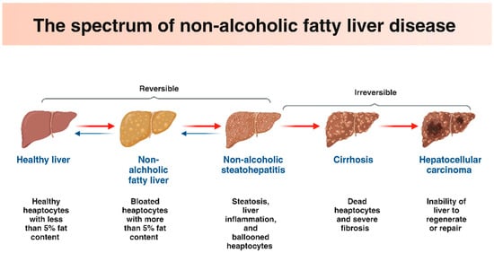 A balance between lipid anabolic and catabolic events, which regulate lipid levels in hepatic cells, allows for the maintenance of lipid homeostasis in cells [11]. This delicate balance shifts out of equilibrium within liver cells, resulting in metabolic illnesses, including NAFLD [11]. The term NAFLD, which was first used to describe the condition in the 1980s, is a multisystem disease that covers a wide histological continuum, from excessive fat deposits in the liver (steatosis) to more severe clinical manifestation non-alcoholic steatohepatitis (NASH), which is characterized by hepatic inflammation (steatohepatitis), which leads to the scarring of liver tissue (fibrosis), and the last stage could be hepatocellular carcinoma (HCC) [12]. Hepatic steatosis denotes the initial recoverable phase of NAFLD, whereas NASH indicates an inflammatory condition of the liver characterized by persistent oxidative stress and impairment [13] (Figure 1). The treatment of NAFLD and its associated comorbidities, such as insulin resistance (IR), cardiovascular disease, and diabetic nephropathy, are currently being researched to target hepatic lipid metabolism [14].