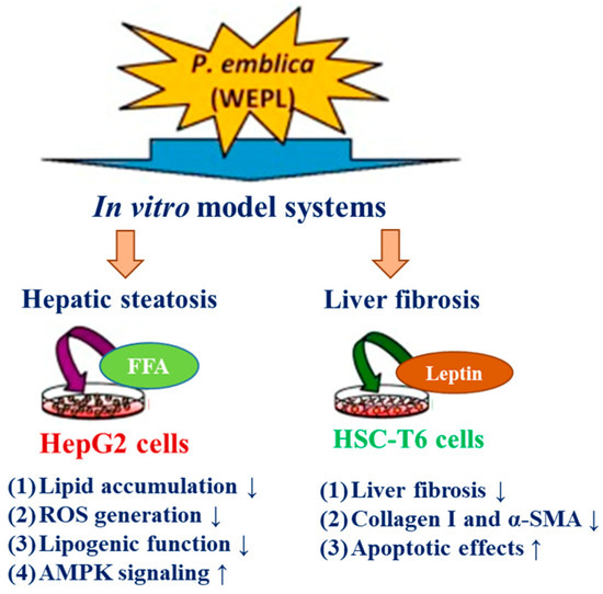 Water extract from P. emblica fruits (WEPL) showed promising inhibitory effects on hepatic steatosis and liver fibrosis in an in vitro NAFLD model using HepG2 and rat hepatic stellate cells (HSC-T6) [83] (Figure 6).