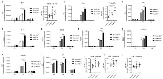 Pro-inflammatory changes in the brain of Shank3b+/+, Shank3b+/−, and Shank3b−/− mice. (a) TNF mRNA expression in the cerebral cortex (Cx), cerebellum (Cb), and hippocampus (Hp) of Shank3b+/+, Shank3b+/−, and Shank3b−/− mice measured using RT-qPCR and TNF expression at the protein level (shown as mean fluorescence intensity, MFI) within cerebellar CD14+ cells assessed using flow cytometry. (b) IFNγ mRNA expression in the Cx, Cb, and Hp and IFNγ levels within cerebellar T cells. mRNA expression of (c) IL-6, (d) IL-1β, (e) CCL3, (f) CCL5, (g) CCL20, (h) MMP8, and (i) p21 in the Cx, Cb, and Hp. mRNA expression was normalized against the housekeeping gene β-actin. (j) TNF MFI within CD14+ cells, IFNγ MFI within (k) CD8+ T cells and (l) CD4+ T cells in the PB of Shank3b+/+, Shank3b+/−, and Shank3b−/− mice. One-way ANOVA, Tukey’s post-hoc test. N = 8 per group (RT-qPCR); n = 10–12 per group (flow cytometry). * p < 0.05; ** p < 0.01; *** p < 0.001; **** p < 0.0001.