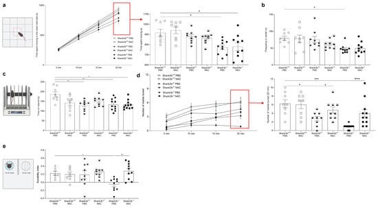 In our previous work on mice lacking the ASD-relevant gene Cntnap2, we showed that N-acetylcysteine (NAC) may act as anti-inflammatory molecule within the cerebellum and in the periphery [12]. To assess whether ASD-related behaviors may be improved in the Shank3b model, NAC was intraperitoneally injected once a day for 28 days into Shank3b+/+, Shank3b+/−, and Shank3b−/− mice. At the end of the treatment, behavioral tests were performed on NAC- and PBS-treated mice to assess motor (open field and rotarod test), repetitive (marble burying test), and social behaviors (three-chamber social test) (Figure 3). As previously described [18,19], PBS-treated Shank3b−/− mice were hypoactive and spent less time moving in the open-field arena when compared to control mice (Figure 3a). These differences increased over time, and they were particularly evident after 20 min of testing. In addition, Shank3b−/− mice spent less time in the central part of the arena compared to the Shank3b+/+ mice, suggesting that anxiety-like behaviors may be present in these mice (Figure 3b). Despite this, no differences across genotypes were found after the administration of NAC. Furthermore, motor coordination was measured in NAC- and PBS-treated animals using a rotarod test (Figure 3c). Reduced time on the rotarod was found in both PBS-treated Shank3b+/− and Shank3b−/− mice in comparison with Shank3b+/+ controls, but no changes were observed after NAC administration. Next, a marble burying test was performed to investigate repetitive behaviors (Figure 3d). Again, differences between groups became evident over time, and they were quantified at the end of the test (20 min). When the PBS-treated groups were compared, the number of buried marbles decreased in Shank3b+/− and was the lowest in Shank3b−/− animals in comparison with Shank3b+/+ mice. Interestingly, a partial rescue in the phenotype was observed in both Shank3b+/− and Shank3b−/− animals after the injection of NAC (Figure 3d). We finally assessed social behavior in all experimental groups using the three-chamber social test (Figure 3e). As expected, PBS-treated Shank3b−/− mice showed a reduced sociability index compared to Shank3b+/+ control mice. Importantly, social impairments were completely rescued in Shank3b−/− mice administered with NAC. No differences were observed between Shank3b+/− and Shank3b+/+ mice in either the PBS- or NAC-treated groups. Taken together, these results show that NAC treatment could completely rescue sociability in Shank3b−/− mice.