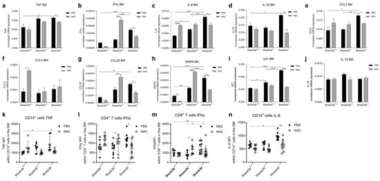 As the imbalanced production of pro-inflammatory cytokines was additionally observed in the BM of Shank3b−/− mice, the expression of molecules related to inflammation was assessed within the BM of PBS- and NAC-treated mutant and Shank3b+/+ mice (Figure 5). The levels of all TNF, IFNγ, IL-6, and IL-1β in Shank3b−/− mice were reduced after NAC administration (Figure 5a–d). The situation was completely different for the Shank3b+/− group, in which NAC treatment increased IFNγ mRNA levels but had no effect on the expression of the other molecules in comparison with their respective controls. Furthermore, increased IL-6 mRNA levels and no differences in the other molecules were found in Shank3b+/+ animals. Similar results were observed when the mRNA expression of CCL3, CCL5, and CCL20 chemokines was assessed (Figure 5e–g). Following NAC treatment, CCL3 and CCL20 mRNA levels decreased in Shank3b−/− mice, CCL20 increased in Shank3b+/− mice, and CCL5 increased in Shank3b+/+ animals compared to their respective PBS-treated controls. Furthermore, NAC reduced MMP8 expression in the Shank3b+/+ and Shank3b−/− groups, while increased levels were found in NAC-treated Shank3b+/− mice. In parallel, similarly to what was observed in the cerebellum, p21 mRNA expression was decreased in NAC-treated Shank3b−/− mice, while no differences were found in the other groups. In addition, the levels of memory T cell-survival factor IL-15 did not vary between the groups (Figure 5j). Similar results were obtained when the expression of pro-inflammatory cytokines was measured at the protein level (Figure 5k–n). Indeed, the reduced expression of TNF within CD14+ cells, IFNγ in CD4+ and CD8+ T cells, and IL-6 within CD14+ cells was observed in NAC-treated Shank3b−/− mice compared with that in the PBS-treated mice. Increased IFNγ levels in CD4+ and CD8+ T cells were present in NAC-treated Shank3b+/− mice, while no differences were detected in the Shank3b+/+ group. Taken together, these results indicate that NAC counteracts immune dysfunction in the BM of Shank3b−/− mice.