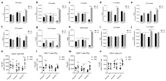 Pro-inflammatory molecules in the spleens of Shank3b+/+, Shank3b+/−, and Shank3b−/− mice treated with NAC. mRNA expression of (a) TNF, (b) IFNγ, (c) IL-6, (d) IL-1β, (e) CCL3, (f) CCL5, (g) CCL20, (h) MMP8, (i) p21, and (j) IL-15 in the spleens of NAC-treated Shank3b+/+, Shank3b+/−, and Shank3b−/− mice and PBS-treated control animals assessed using RT-qPCR. mRNA expression was normalized against the housekeeping gene β-actin. n=8 in each group. Mean fluorescence intensity (MFI) of (k) TNF within CD14+ cells, (l) IFNγ within CD4+ T cells, (m) IFNγ within CD8+ T cells, and (n) IL-6 within CD14+ cells in the spleen measured using flow cytometry. n = 8 (Shank3b+/+, PBS), n = 8 (Shank3b+/+, NAC), n = 9 (Shank3b+/−, PBS), n = 9 (Shank3b+/−, NAC), n = 9–11 (Shank3b−/−, PBS), n = 10 (Shank3b−/−, NAC). Two-way ANOVA, Tukey’s post-hoc test. * p < 0.05; ** p < 0.01, *** p < 0.001, **** p < 0.0001.