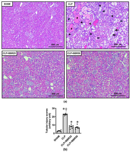 Effects of CLP induction and BBR treatment on renal histopathological changes; (a) kidney sections stained with hematoxylin and eosin (H&E, 4× magnification); (b) tubular injury score. Values are means ± SEM (n = 6 each). Each data point represents the average of three biological replicates. SHAM: rats treated with vehicle and underwent sham operation; CLP: rats treated with vehicle and underwent CLP induction; CLP+BBR25 and CLP+BBR50: rats treated with BBR 25 and 50 mg/kg, respectively, and underwent CLP induction. * p < 0.05 vs. SHAM, † p < 0.05 vs. CLP+BBR. The double arrow indicates tubular dilatation with brush border loss; the block arrow denotes tubular obstruction; the hash sign (#) shows hyaline casts; the asterisk (*) highlights inflammatory infiltration; and the arrowhead points to apoptotic cells.