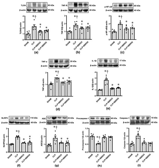Effects of CLP induction and BBR treatment on renal cortical expression of (a) TLR4; (b) TNF-R; (c) pNF-κB; (d) TNF-α; (e) IL-1β; (f) NLRP3; (g) ASC; (h) procaspase-1; and (i) caspase-1. β-actin was used as a loading control. Values are means ± SEM (n = 6 each). SHAM: rats treated with vehicle and underwent sham operation; CLP: rats treated with vehicle and underwent CLP induction; CLP+BBR25 and CLP+BBR50: rats treated with BBR 25 and 50 mg/kg, respectively, and underwent CLP induction. * p < 0.05 vs. SHAM, † p < 0.05 vs. CLP+BBR.